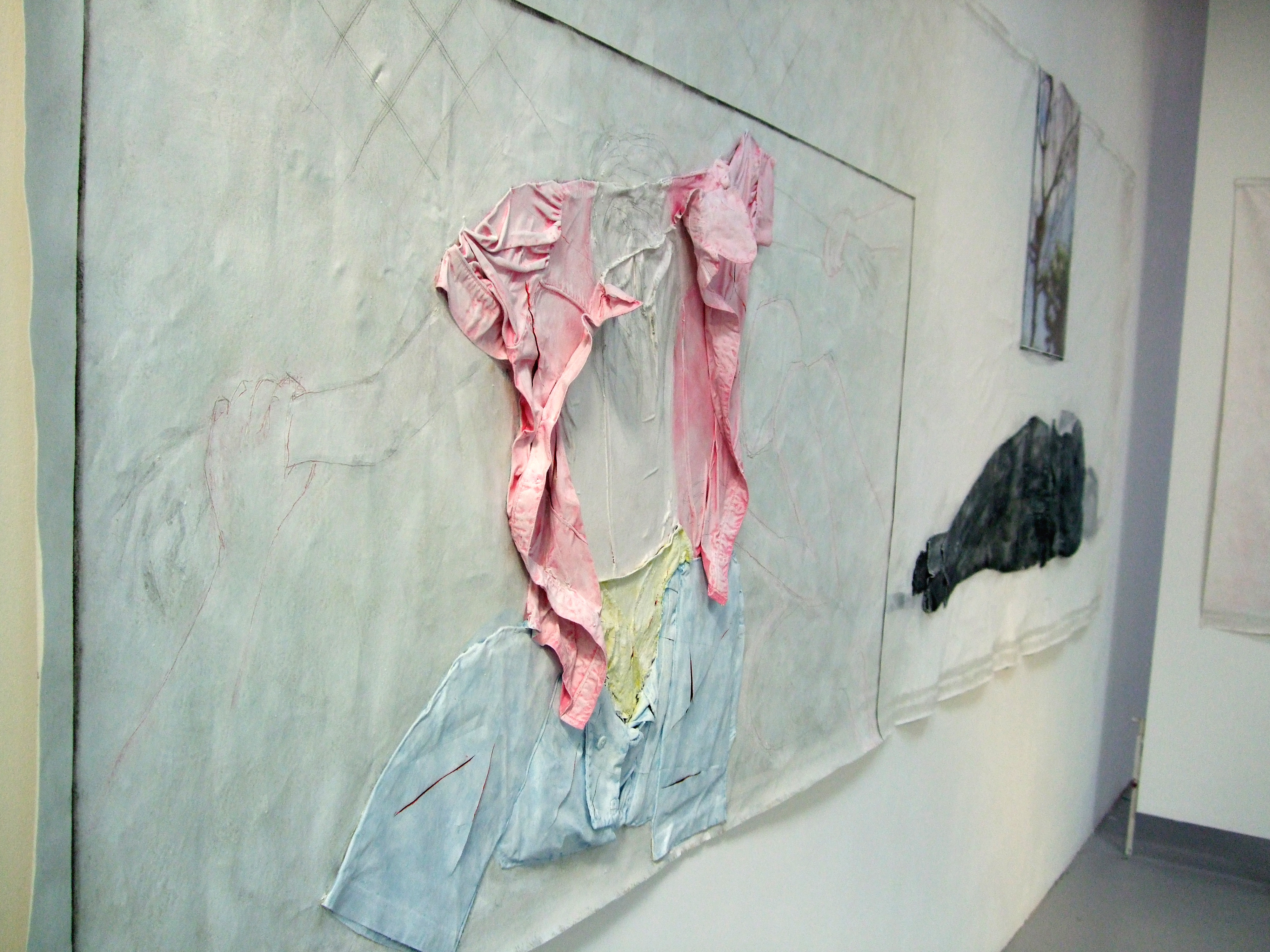 Visually inspired by Hellenistic sculpture, most specifically The Pergamon Altar. The female figures are made from my clothes hand-sewn onto gessoed canvas. I then used ink, sparkly dust, oil paint, graphite, and oil bars to create the environment and nauseating color. The appliqued photographs are taken from the window of my room I had growing up.