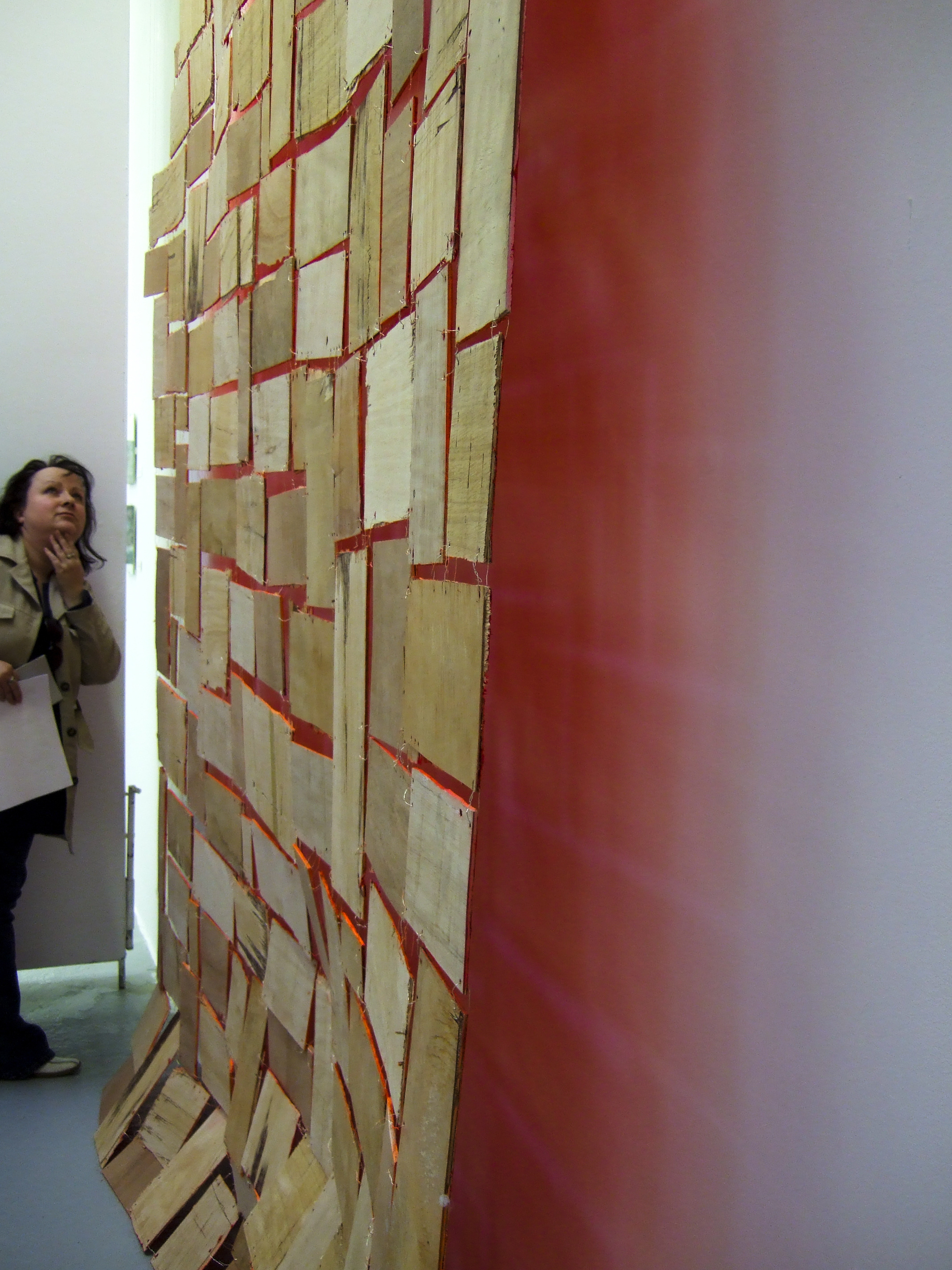 The wood is drawn from the wooden houses of the place I come from. The chunks are drawn from the stone block construction found in Ireland. My Home is the same shape and size as a ruin of a church near Ballyvaughan. The glow (created by painting the back with florescent orange) is meant to be cozy, but also to give a sense of fire. There is no way in and no way out. My Home is portable and right now is living in two suitcases.